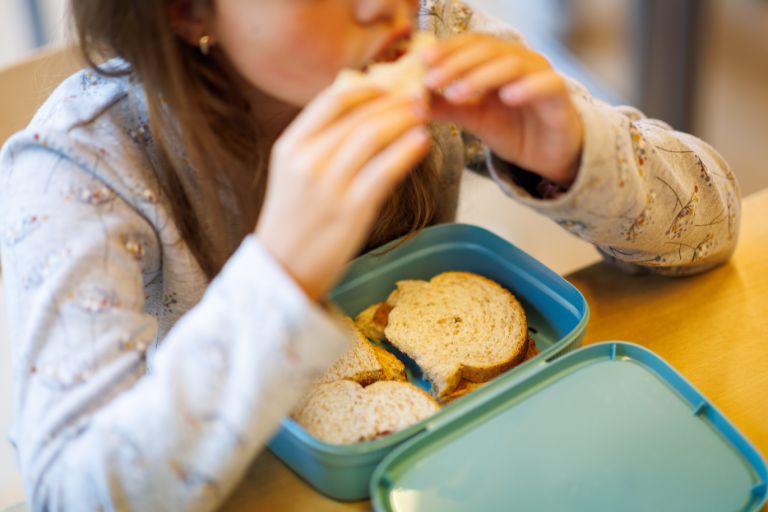 De kinderen lunchen in de klas onder leiding van de leerkracht. Zij brengen een lunch mee naar school: een trommeltje met brood en eventueel een groentesnack (stukje komkommer, radijsjes, tomaatjes) en een beker met drinken (bijvoorbeeld vruchtensap of een melkproduct).